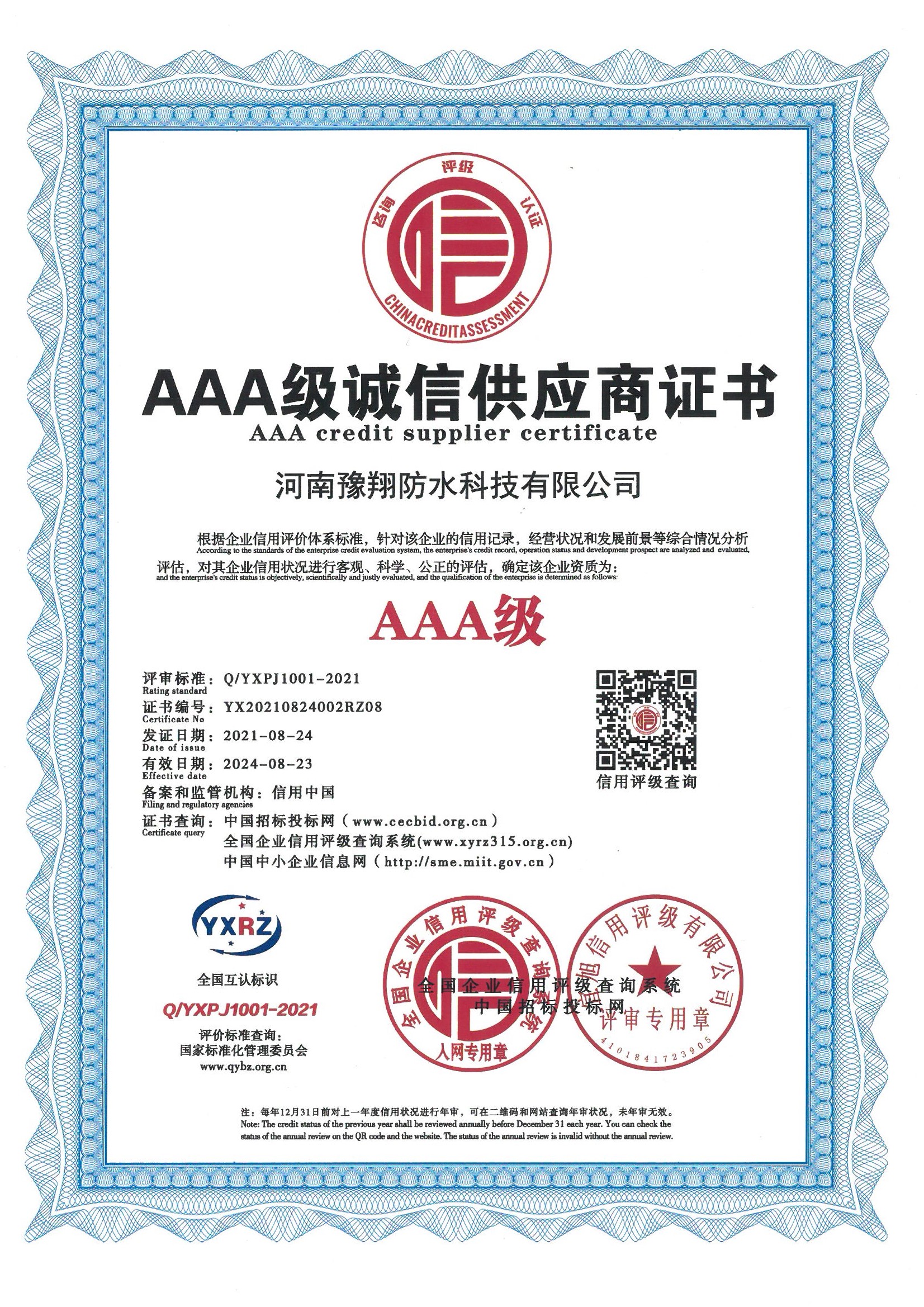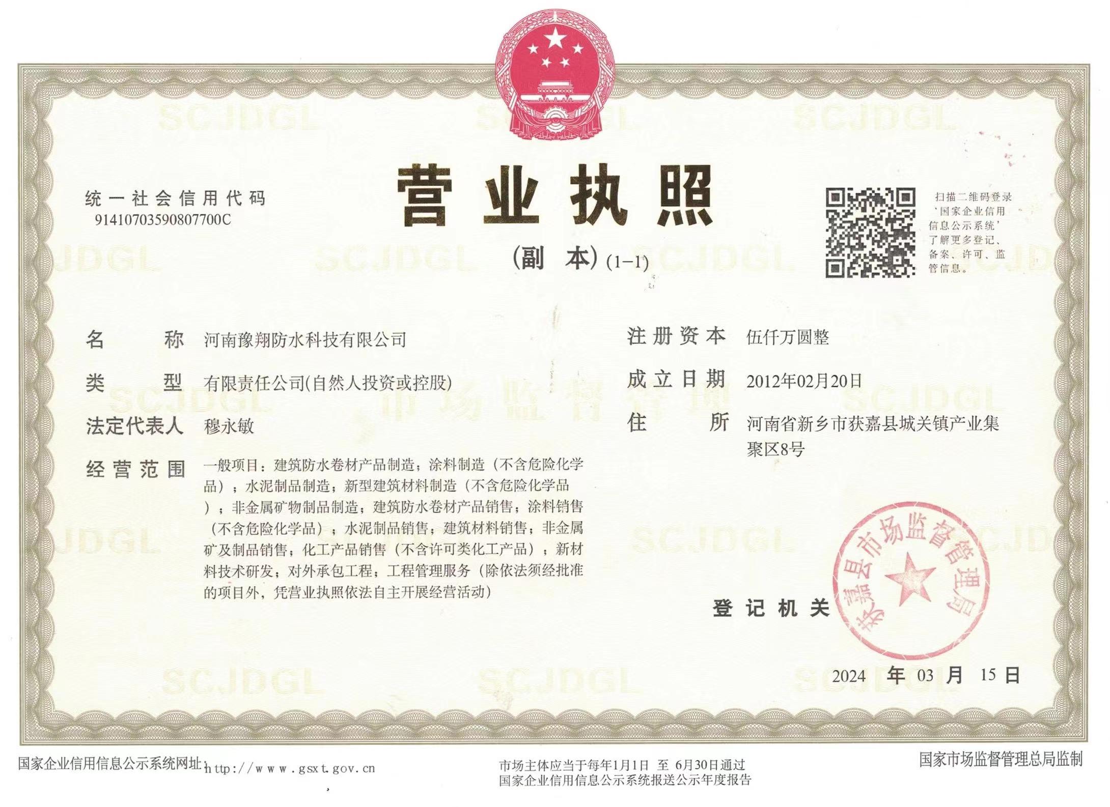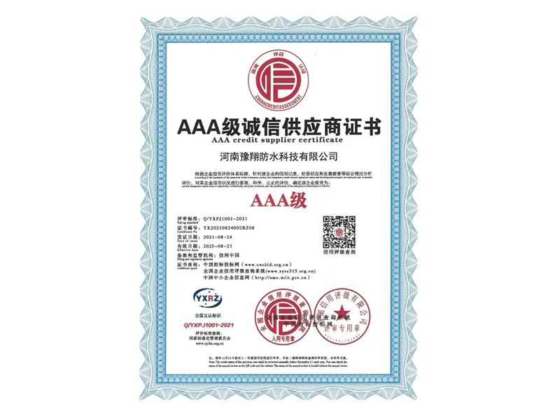 公司是中國建筑防水協會會員單位、河南省建筑防水協會會員單位、中國中鐵建筑CRCC認證合作單位、中國中輕產品質量保障CQGC認證單位、國家康居示范工程產品單位、中國綠色環保家裝產品推廣單位、全國道橋高分子防水涂料國家標準參編單位,連續多年被評為“中國3.15誠信企業”、河南省“守合同重信用企業”。
